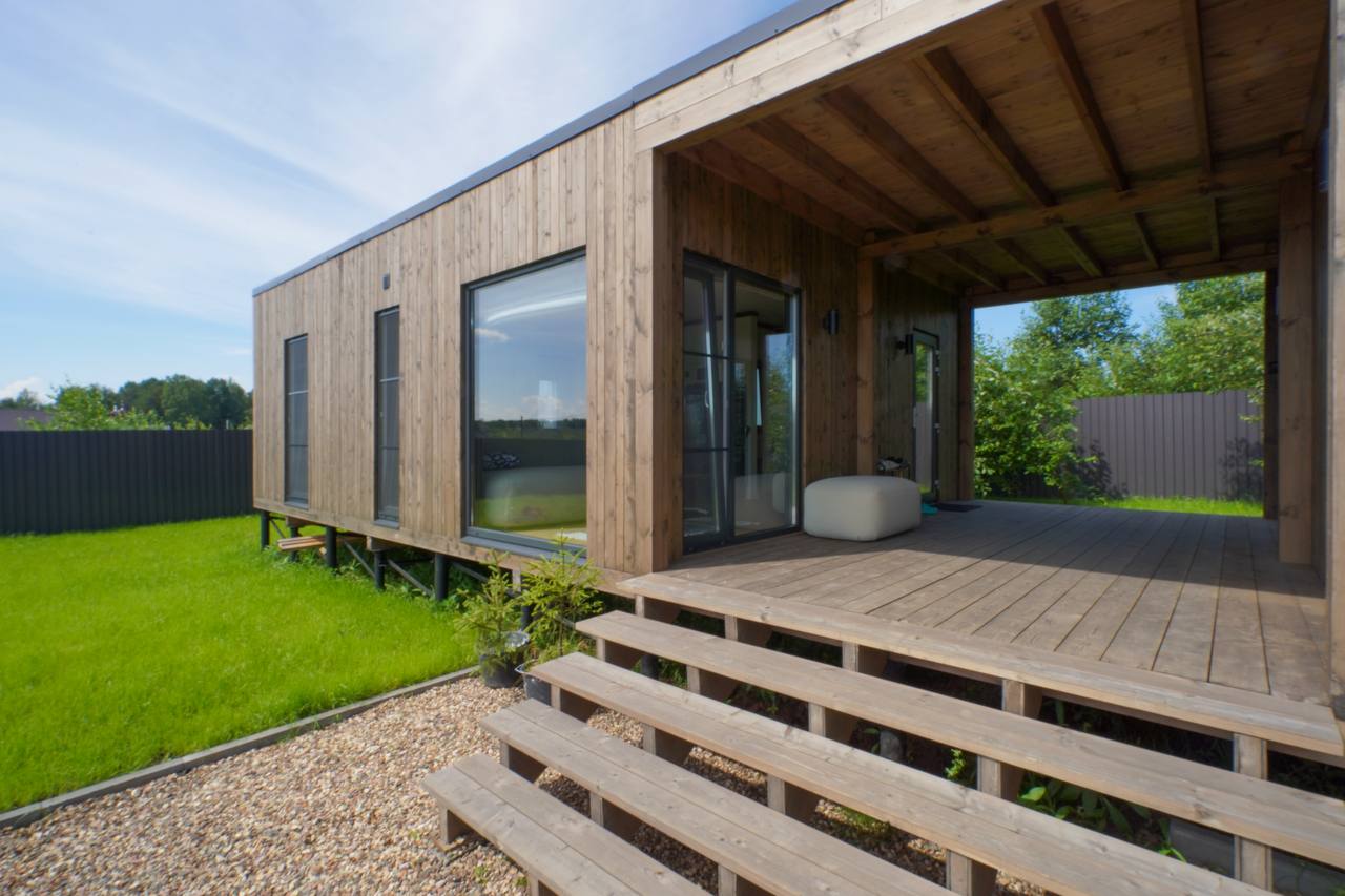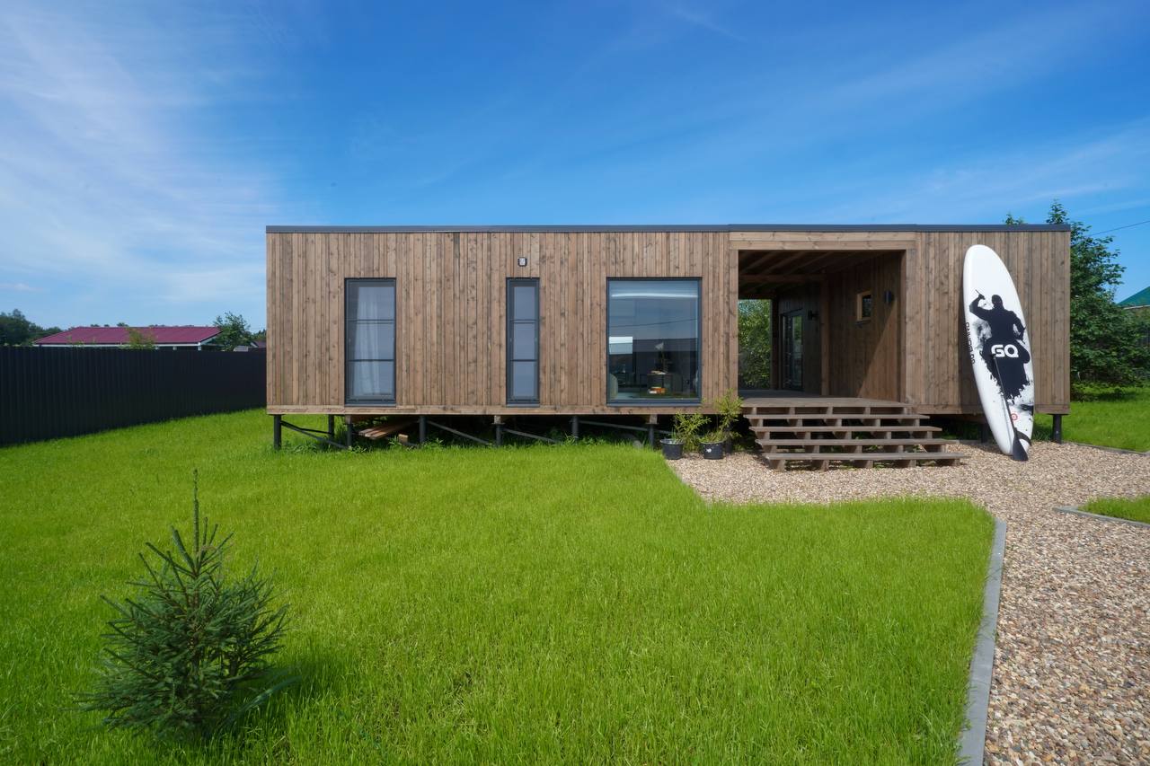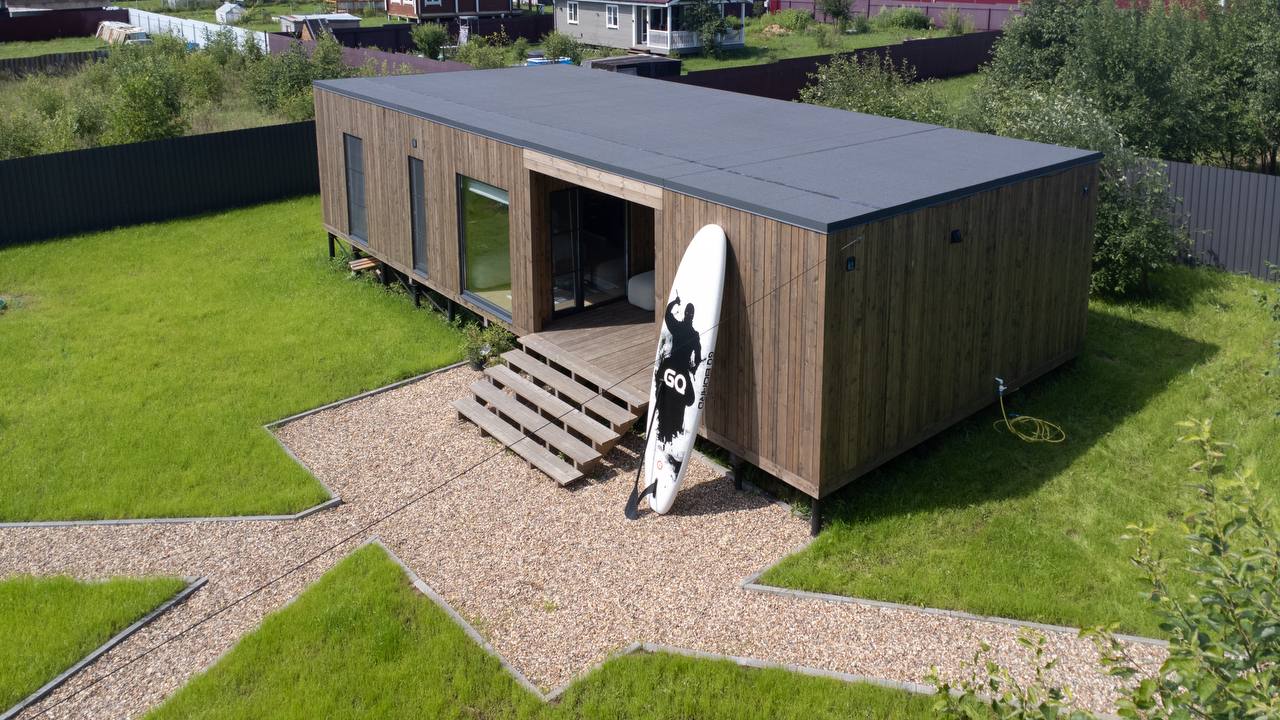 Тут у нас 3 модульный дом + 1 модульная баня. Соединены крытой террасой. Кажется, это идеально для небольшой дачи! Или арендного бизнеса)