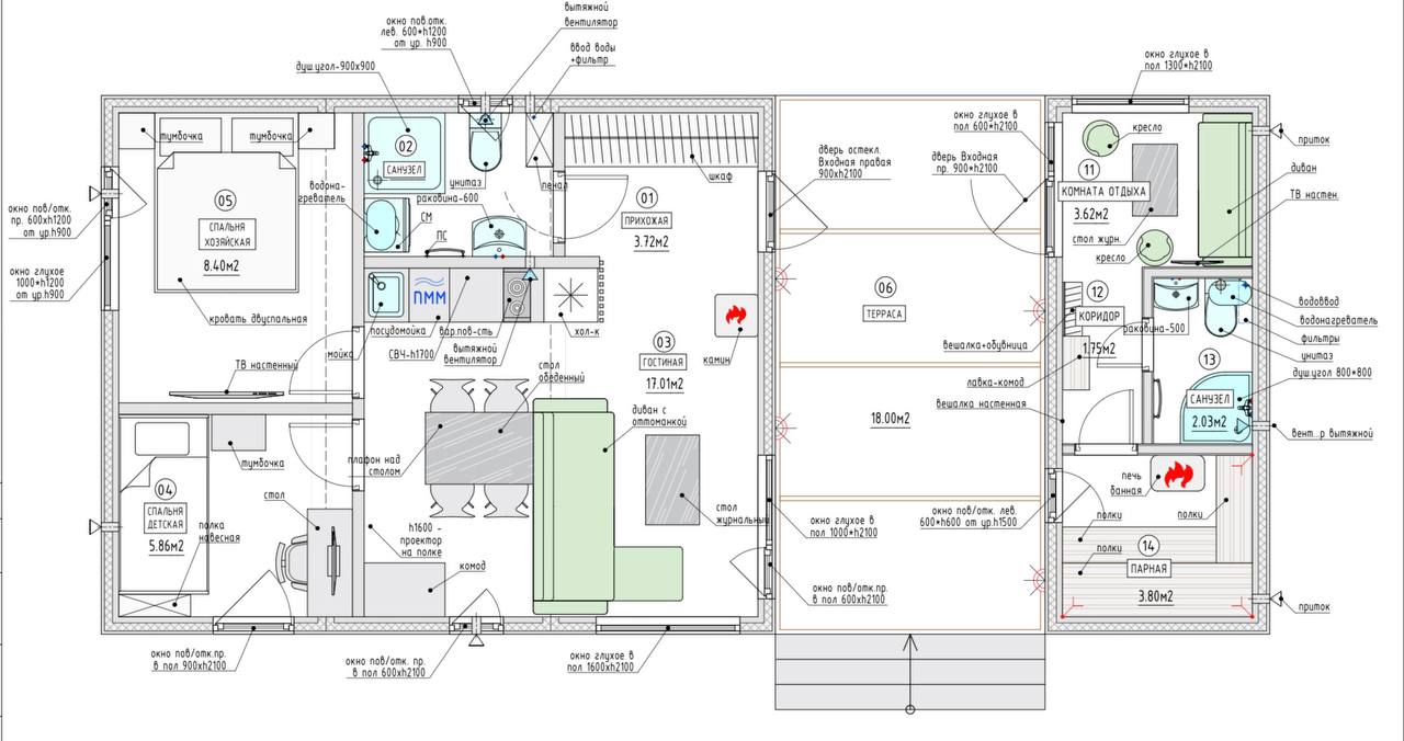 Теплая площадь жилой части (сумма площадей комнат) - 38 кв.м. Модуль бани- 11,2 кв.м. Терраса 18 кв.м. Внешние габариты всего дома 14 на 6 м